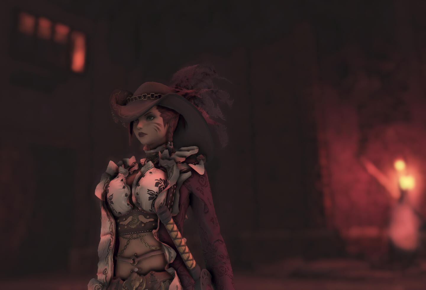 BackgroundU’randir Jihn, a Miqo’te cartographer, left her life in the Sagolii Desert to start anew in Limsa Lominsa when she was just 16. She distanced herself from the U tribe and its harsh customs, including the fear of losing her ears for disobeying the Nunh. When in Limsa, her knowledge of navigation and cartography caught the attention of the Sanguine Sirens, a group of pirates led by Captain Rhoswen Leach. She joined the Sanguine Sirens as a cartographer while on expedition and serving as a warrior during exploration and combat. During her time aboard Captain Rhoswen’s ship, U’randir grew fond of the sea, her love for exploring the world’s secrets matched only by her passion for collecting maps.Her travels led her to a fateful meeting with Ylfa, who enlisted her to navigate one of Ylfa's trade ships. The two bonded over their shared respect for nature with U’randir’s U tribe upbringing and Ylfa's Viera ways. However, their journey took a dark turn when, during an expedition through the Sirensong Sea, U’randir was possessed by a spirit while fighting a swarm of dark creatures in an abandoned dungeon. What she thought was a Siren attack turned out to be an ancient aetheric presence that took hold of her.The spirit, Royal Orleans, manifests as a pirate in a revealing, lace-trimmed outfit, taking control of U’randir’s body at will. U’randir's right eye, now gray, is the spirit’s window to the world, and the Miqo’te wears an eye-patch to prevent Royal from seeing her actions. But Royal relishes her control, constantly flickering in and out of her appealing form and the spectral presence beneath. The two battle for control over their shared body, with U’randir trying to regain dominance while Royal enjoys tormenting her.U’randir’s connection to the seas is paradoxical. Her guardian is not Llymlaen, the Navigator, but Nymeia, the Spinner, who maps the fates of individuals. This has made her even more in tune with the world, her cartographic skills intertwined with a sense of destiny as she charts the unknown, desperate to uncover the world’s secrets. Her journey after the Calamity was filled with restless re-charting, unable to cope with the changes wrought by the disaster. For U’randir, collecting a map feels like holding the stories, legends, and mysteries of that region.She remains a sought-after freelance cartographer, constantly on the move, driven by her unyielding need to explore and map Hydaelyn. She travels from one corner of the world to the next, hired by adventurers, treasure hunters, and scholars eager to uncover lost secrets. Her expertise in navigating treacherous terrain and uncovering hidden paths has made her invaluable for expeditions. Though her reputation as a cartographer is well-known, she remains deeply entwined in Ylfa's clandestine work. The two share a unique bond, and U’randir still finds herself on the edge of danger, guiding ships or venturing into forbidden ruins, where both her navigational skills and her ability to sense the flow of fate are put to the test. Every new journey is a chance to piece together the world’s mysteries, even as she remains at the mercy of the restless spirit that shares her body.